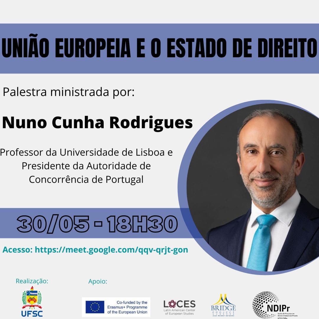 O Projeto Jean Monnet Network BRIDGE, financiado pelo Programa Erasmus+ da União Europeia, e o Núcleo de Pesquisas em Direito Internacional Privado UFSC/CNPq convidam toda a comunidade acadêmica para participar da palestra com Nuno Cunha Rodrigues, Professor da Universidade de Lisboa e Presidente da Autoridade de Concorrência de Portugal, sobre a temática “União Europeia e Estado Democrático de Direito”, a ser realizada no âmbito da disciplina de Direito Internacional, ministrada pela professora Aline Beltrame de Moura na Universidade Federal de Santa Catarina.