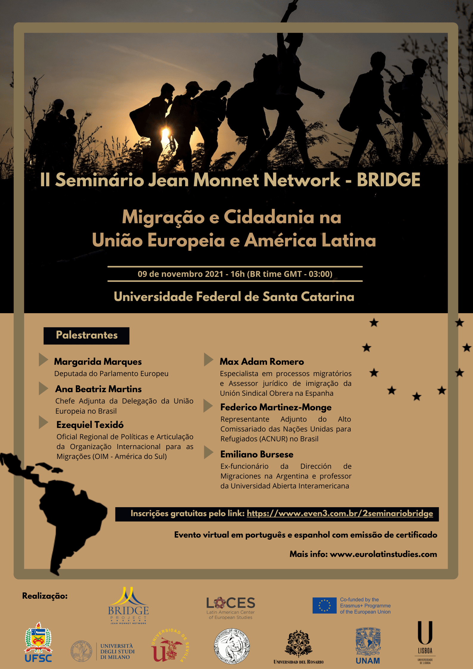 On November 9, 2021, at 4 pm (BR time – GMT -03:00), the Faculty of Law of the Federal University of Santa Catarina will hold a virtually conference, called II Jean Monnet Network Seminar – BRIDGE “Migration and Citizenship in the European Union and Latin America”.