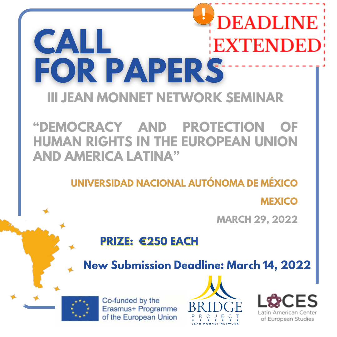El plazo de envío de artículos científicos para el Workship del III Seminario Jean Monnet Network – “Democracia y Protección de los Derechos Humanos en la Unión Europea y América Latina” fue ampliado hasta el 14 de marzo de 2022