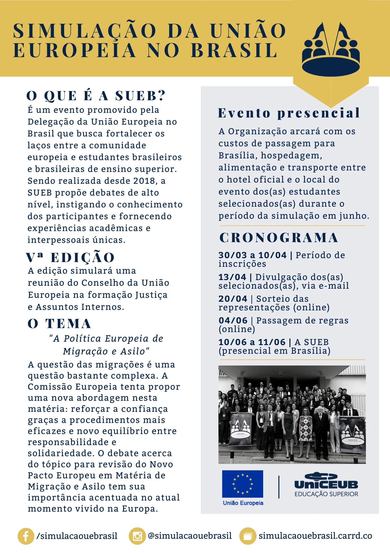 A simulação está prevista para acontecer presencialmente, em Brasília, nos dias 10 e 11 de junho de 2022, para alunos e alunas de todos os níveis de ensino superior brasileiro, e a temática desta edição será a Política Europeia de Migração e Asilo.
