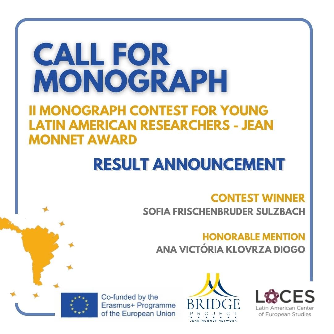 El comité organizador del II Concurso de Monografías para Jóvenes Investigadores Latinoamericanos – Premio Jean Monnet, una iniciativa del proyecto Jean Monnet Network “Building RIghts and Developing KnowledGE between the European Union and Latin-America – BRIDGE Project”, cofinanciado por el Programa Erasmus + de la Unión Europea, y el Centro Latinoamericano de Estudios Europeos, tiene el honor de anunciar el resultado de la segunda edición del referido certamen.