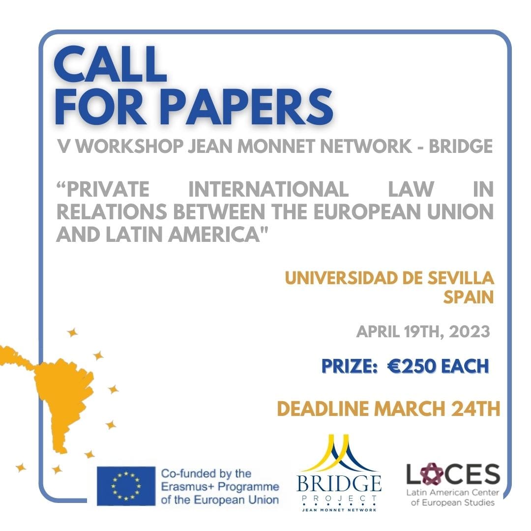 El proyecto Jean Monnet Network – BRIDGE, que es cofinanciado por el Programa Erasmus+ de la Unión Europea, y el Centro Latinoamericano de Estudios Europeos invitan a toda la comunidad académica para enviar sus artículos académicos para el V Workshop del Jean Monnet Network – BRIDGE sobre “El Derecho Internacional privado en las relaciones entre la Unión Europea y América Latina”, que tendrá lugar virtualmente en modalidad híbrida en la Universidad de Sevilla (España) el 19 de abril de 2023.