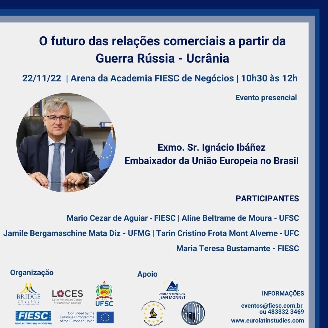 O primeiro encontro ocorrerá às 10h30 na Arena da Academia FIESC de Negócios sobre o “O Futuro das Relações Comerciais a partir da Guerra Rússia-Ucrânia” com a presença do Embaixador da União Europeia no Brasil, Ignacio Ibáñez.
