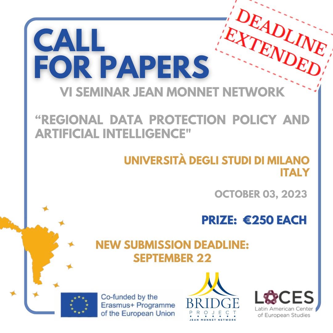 El proyecto Jean Monnet Network – BRIDGE, que es cofinanciado por el Programa Erasmus+ de la Unión Europea, y el Centro Latinoamericano de Estudios Europeos invitan a toda la comunidad académica para enviar sus artículos académicos para el Vl Workshop del Jean Monnet Network – BRIDGE sobre “Política Regional de Protección de Datos e Inteligencia Artificial”, que tendrá lugar virtualmente en modalidad híbrida en la Università degli Studi di Milano (Italia) el 03 de octubre de 2023.