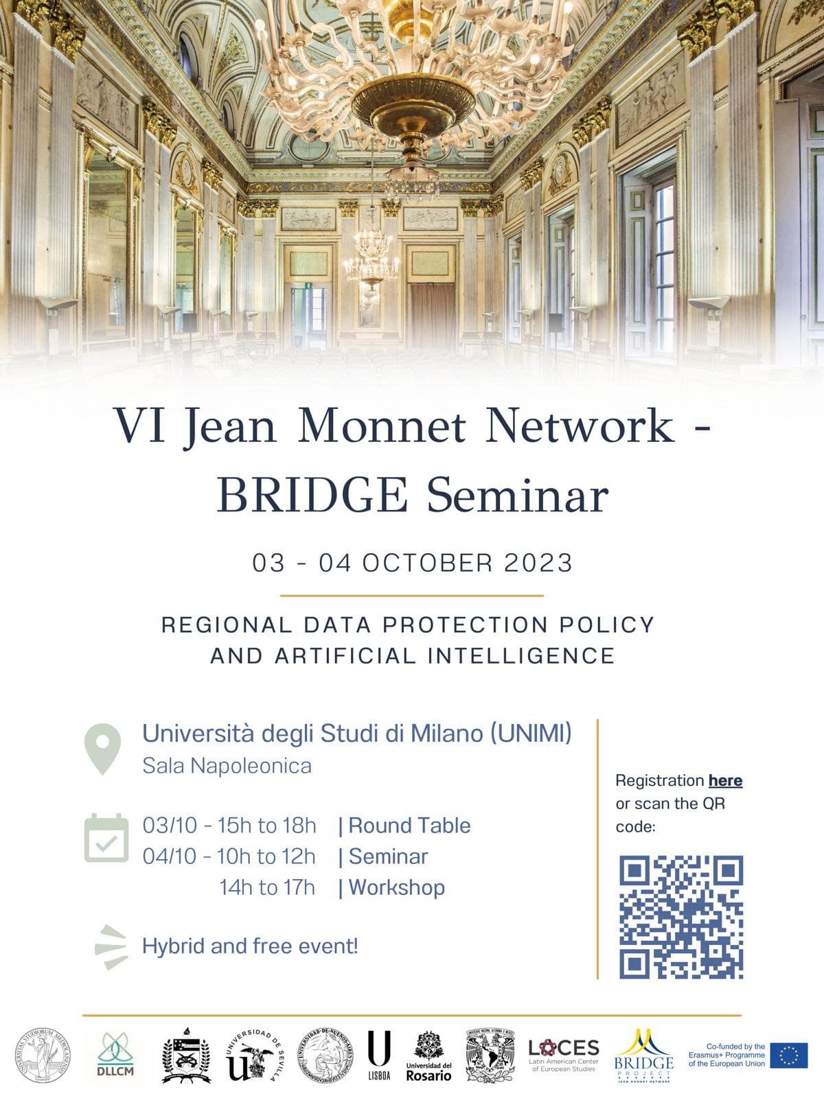 En los días 3 y 4 de octubre de 2023, la red Jean Monnet Network – BRIDGE, proyecto financiado por el Programa Erasmus+ de la Unión Europea, realizará una serie de actividades académicas junto a la Università degli Studi di Milano, en Italia, que reunirá cerca de 30 ponentes de 8 nacionalidades diferentes (Italia, España, Portugal, México, Colombia, Argentina, Brasil y Paraguay). Todas las actividades serán desarrolladas en modalidad híbrida, con el evento presencial teniendo lugar en la Sala Napoleonica (UNIMI).
