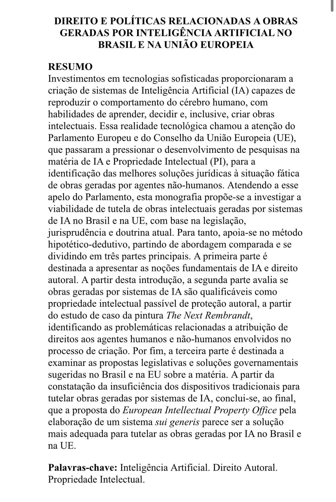 A monografia é de autoria de Sofia Frischenbruder Sulzbach, aluna de graduação em Ciências Jurídicas e Sociais da Universidade Federal do Rio Grande do Sul e tem como títuloDIREITO E POLÍTICAS RELACIONADAS A OBRAS GERADAS POR INTELIGÊNCIA ARTIFICIAL NO BRASIL E NA UNIÃO EUROPEIA.