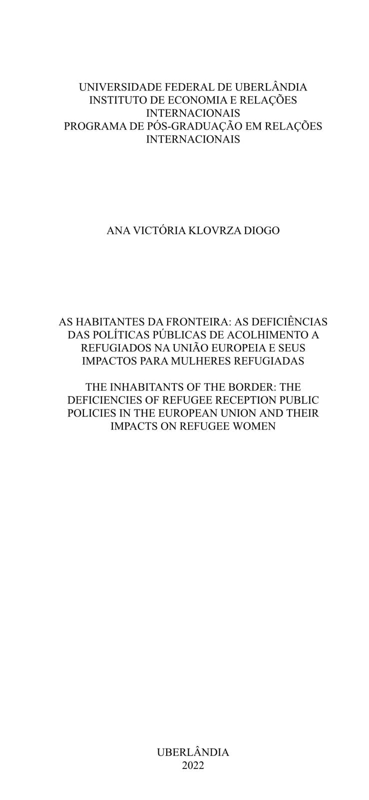 A monografia é de autoria de Ana Victória Klovrza Diogo, aluna do Programa de Pós-Graduação em Relações Internacionais da Universidade Federal de Uberlândia, com a monografia AS HABITANTES DA FRONTEIRA: AS DEFICIÊNCIAS DAS POLÍTICAS PÚBLICAS DE ACOLHIMENTO A REFUGIADOS NA UNIÃO EUROPEIA E SEUS IMPACTOS PARA MULHERES REFUGIADAS.