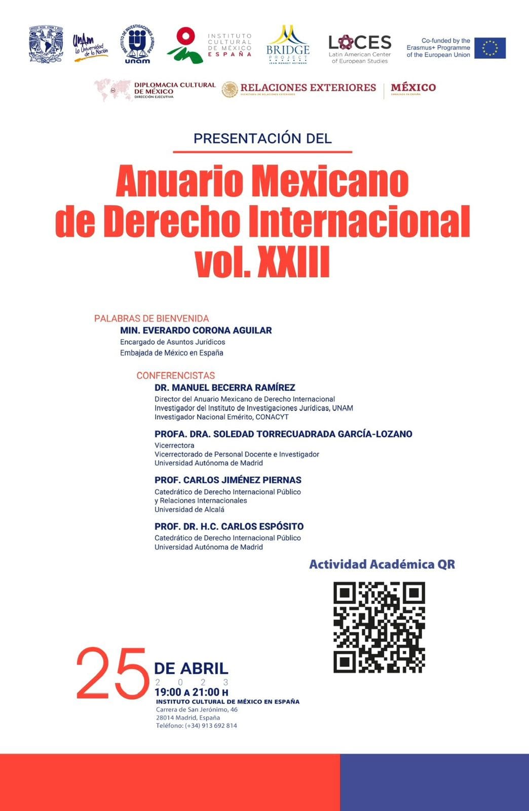 No dia 25 de abril de 2023, no Instituto Cultural de México em España, ocorrerá a apresentação do Anuário Mexicano de Direito Internacional vol. XXlll no Instituto Cultural do México na Espanha, com participação do parceiro do Projeto BRIDGE, Prof. Dr. Manuel Becerra Ramirez.